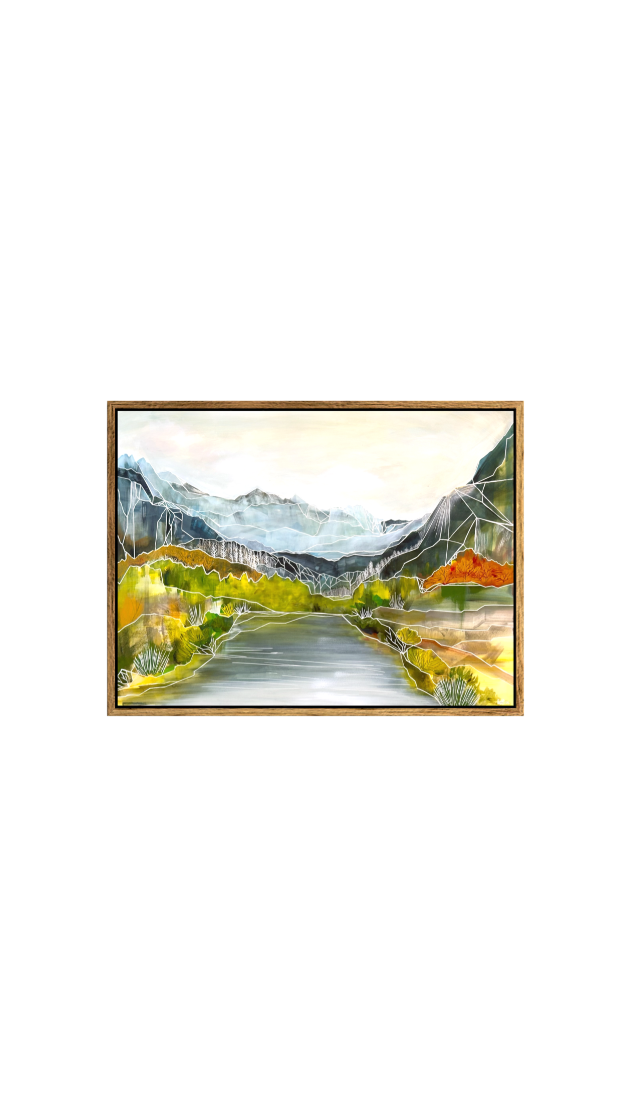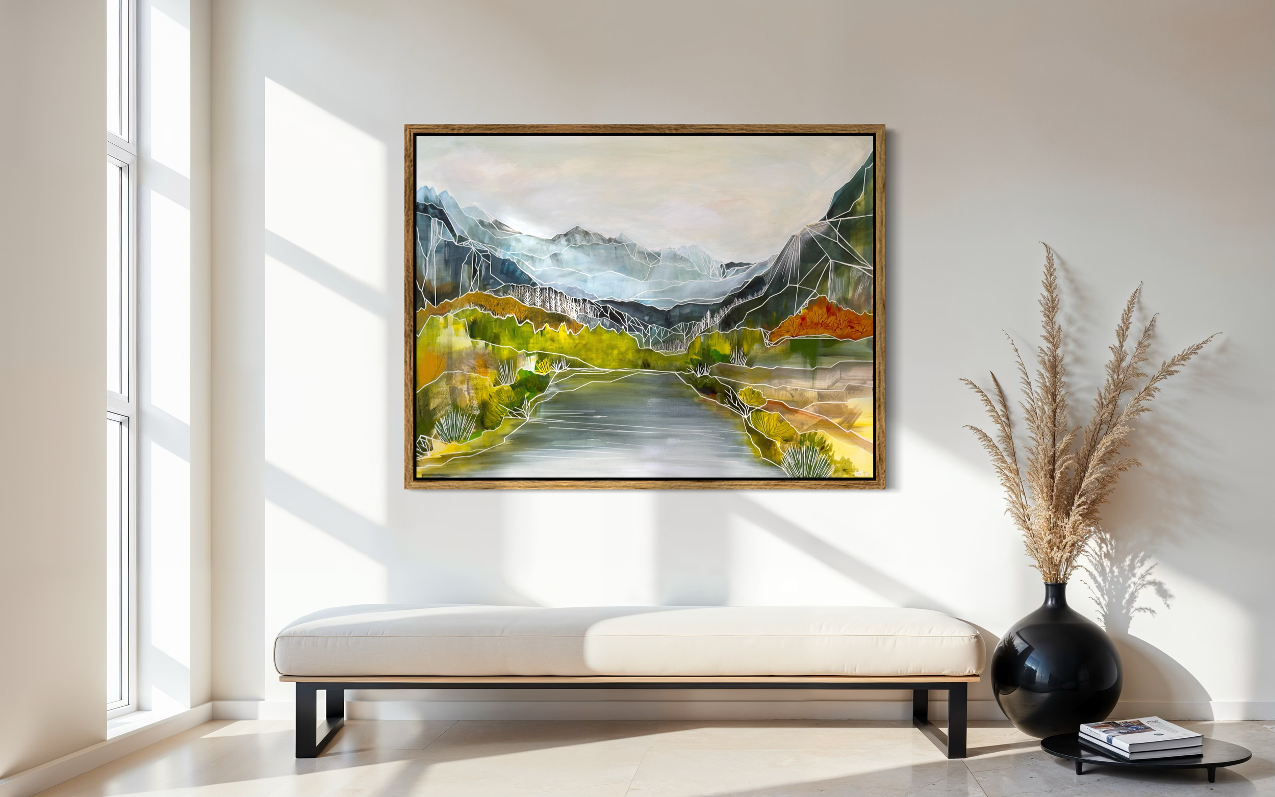 Green hillsides bleeding into gold, a still river caught between mountain walls, and the first cool light of autumn settling over everything. Harvest Hills is a painting about the moment a season turns.
